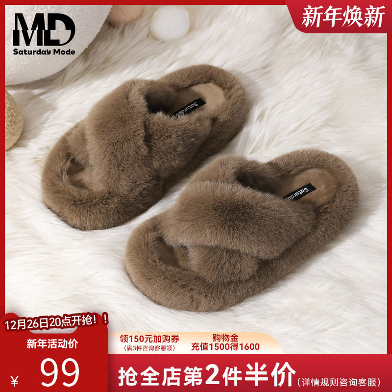 saturdaymode厚底毛毛拖鞋女2025冬季新款外穿保暖防滑一字拖鞋
