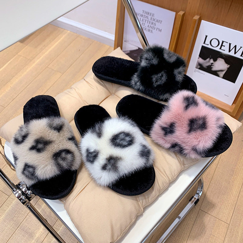 2025秋冬季网红豹纹时尚百搭毛毛拖鞋女外穿一字拖潮鞋厚底棉拖鞋