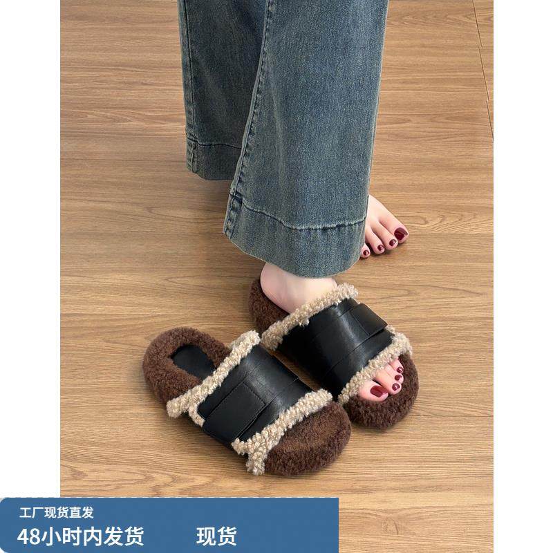 赵露思同款毛毛拖鞋真羊毛女款外穿厚底羊羔毛复古休闲一字拖棉拖