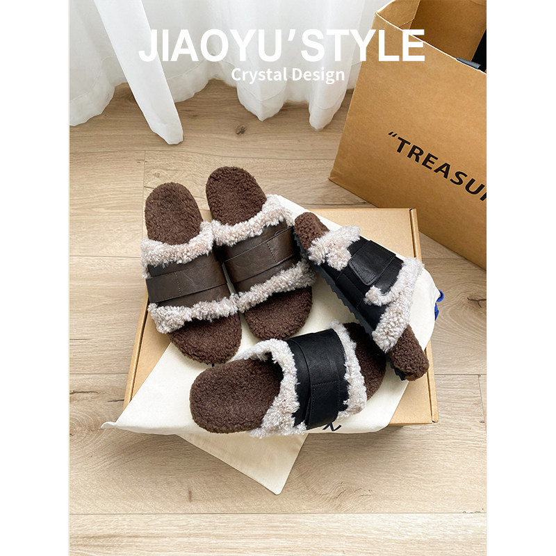 真皮~骄屿毛毛鞋小众设计羊羔毛厚底外穿加绒一字拖鞋外穿女秋冬