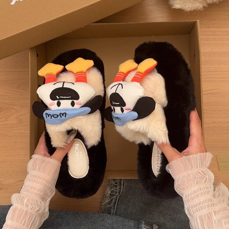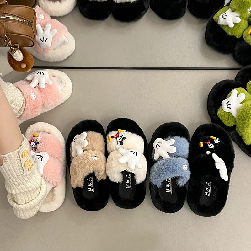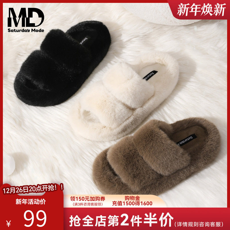 AKM平底可爱毛毛一字拖鞋M豆女外穿秋冬季学生寝室松弛感防滑棉拖