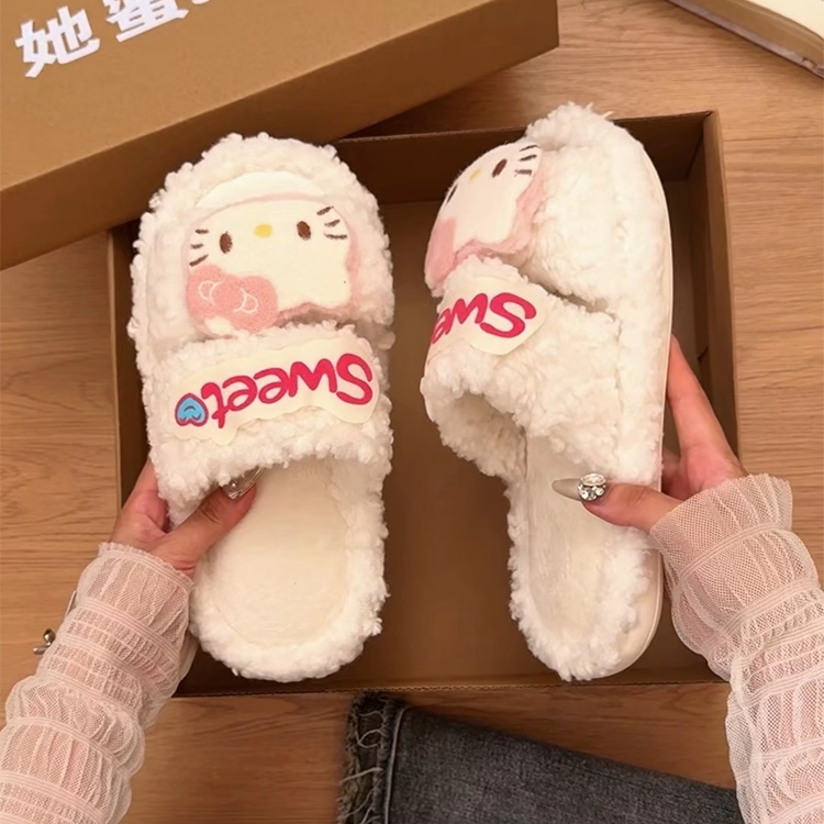 厚底毛毛一字拖鞋女秋冬时尚外穿可爱卡通居家室内防滑百搭毛绒拖