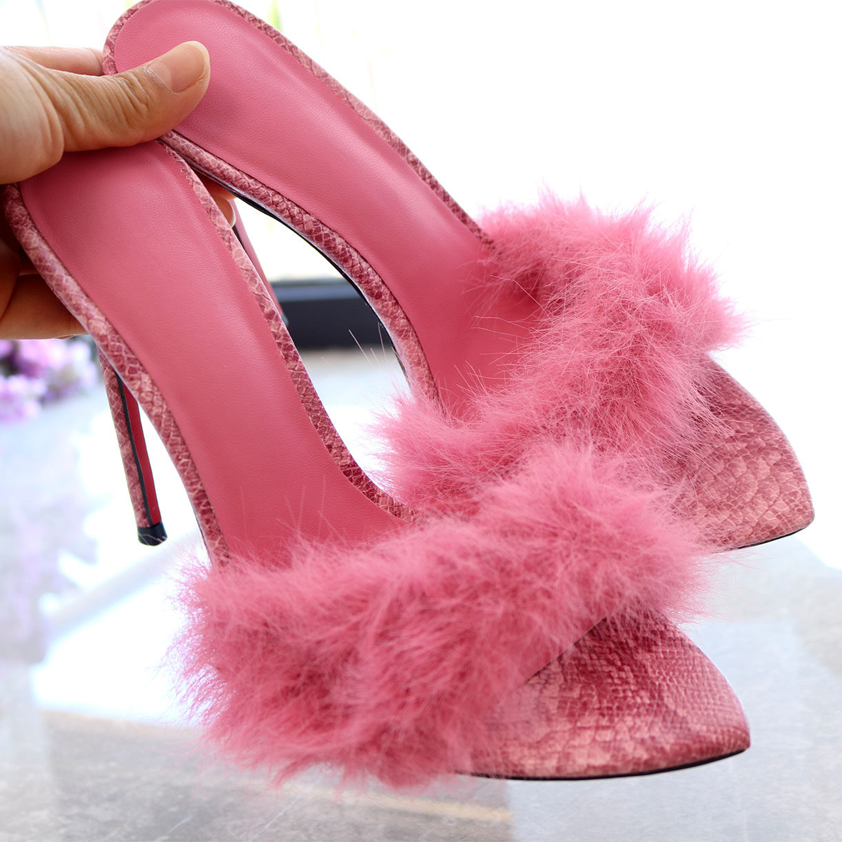 2025秋冬细跟毛毛高跟鞋女外穿豹纹一字拖毛毛拖鞋尖头绝美高跟拖