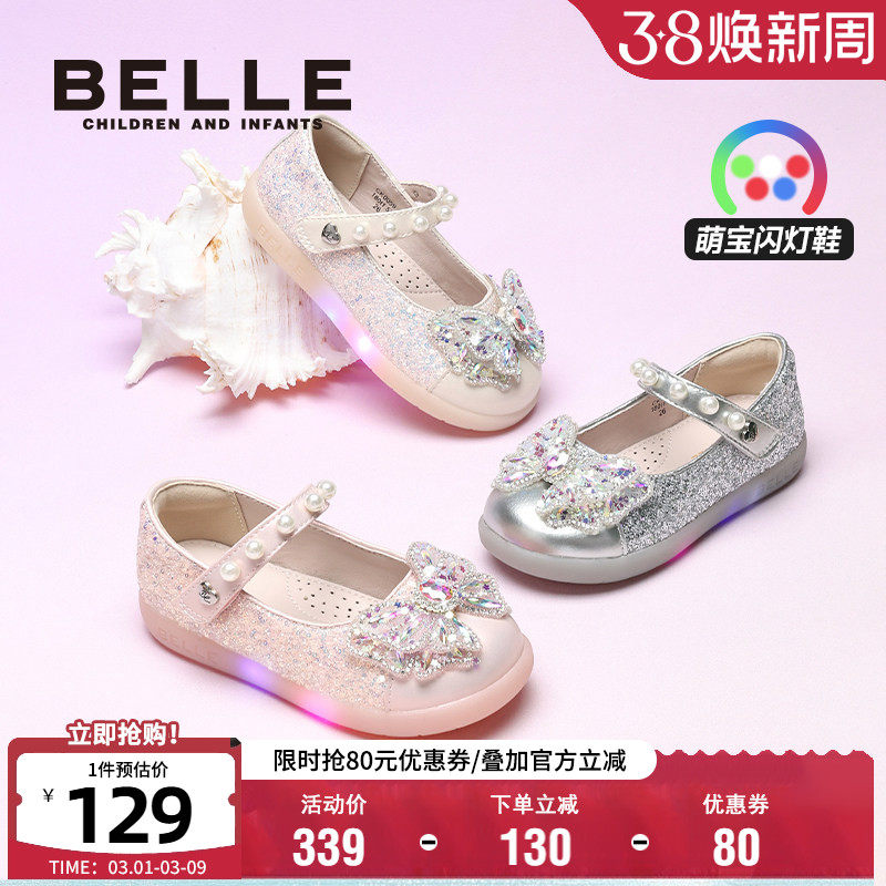 百丽童鞋女童闪灯皮鞋小女孩水晶公主鞋秋季新款儿童时尚发光单鞋