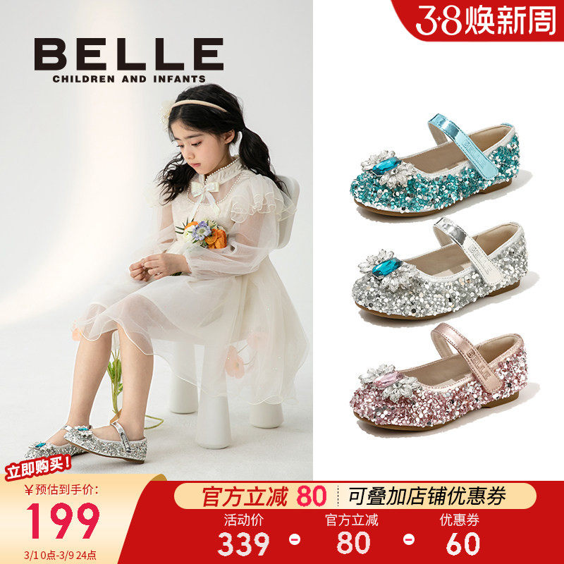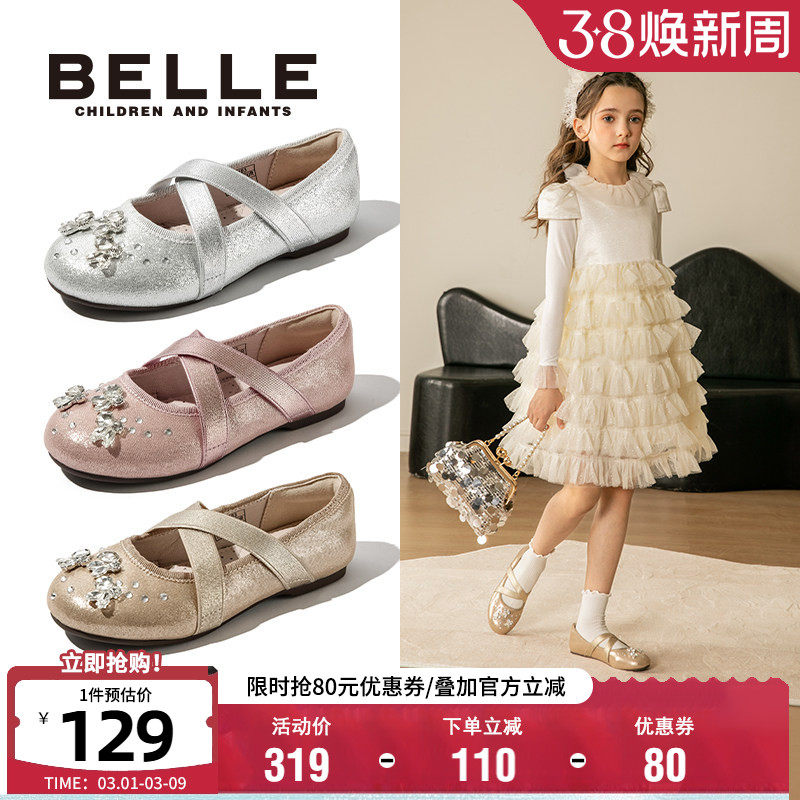百丽童鞋女童皮鞋2026春夏水晶闪钻爱莎公主鞋软底防滑小女孩单鞋