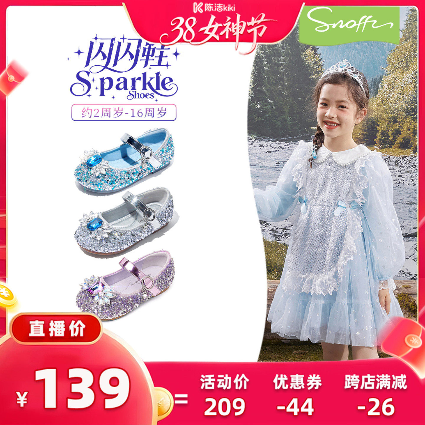 闪闪鞋|斯纳菲女童公主鞋爱莎水晶皮鞋春秋新款小女孩配裙子单鞋