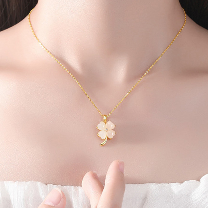 四叶草项链女纯银锁骨链和田玉吊坠2026年新款爆款轻奢小众高级感