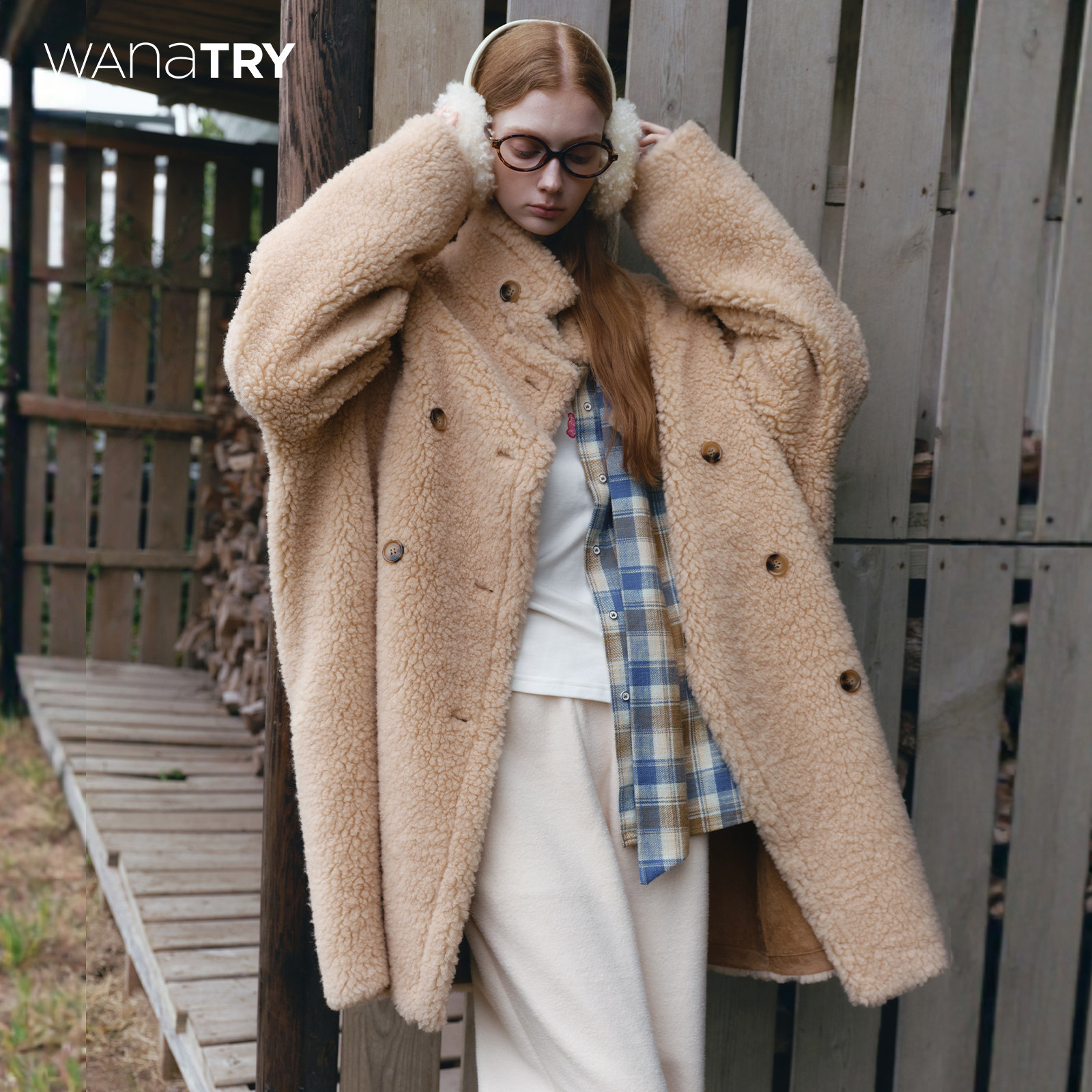 wana try100%绵羊毛复合皮毛一体大衣冬季新款牛角扣外套上衣女装