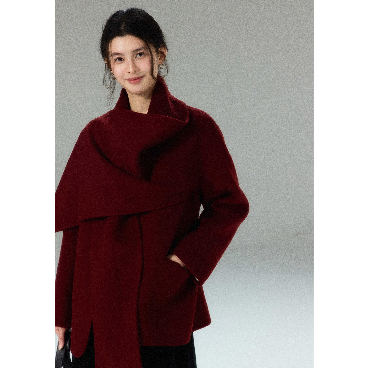 贰羊设计【木槿】高级氛围感羊毛一体披肩红色大衣女秋冬加厚外套