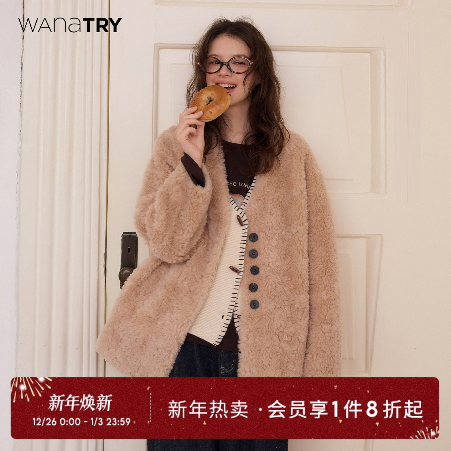 wana try绵羊毛复合皮毛一体大衣冬季新款女翻领外套高级毛毛上衣