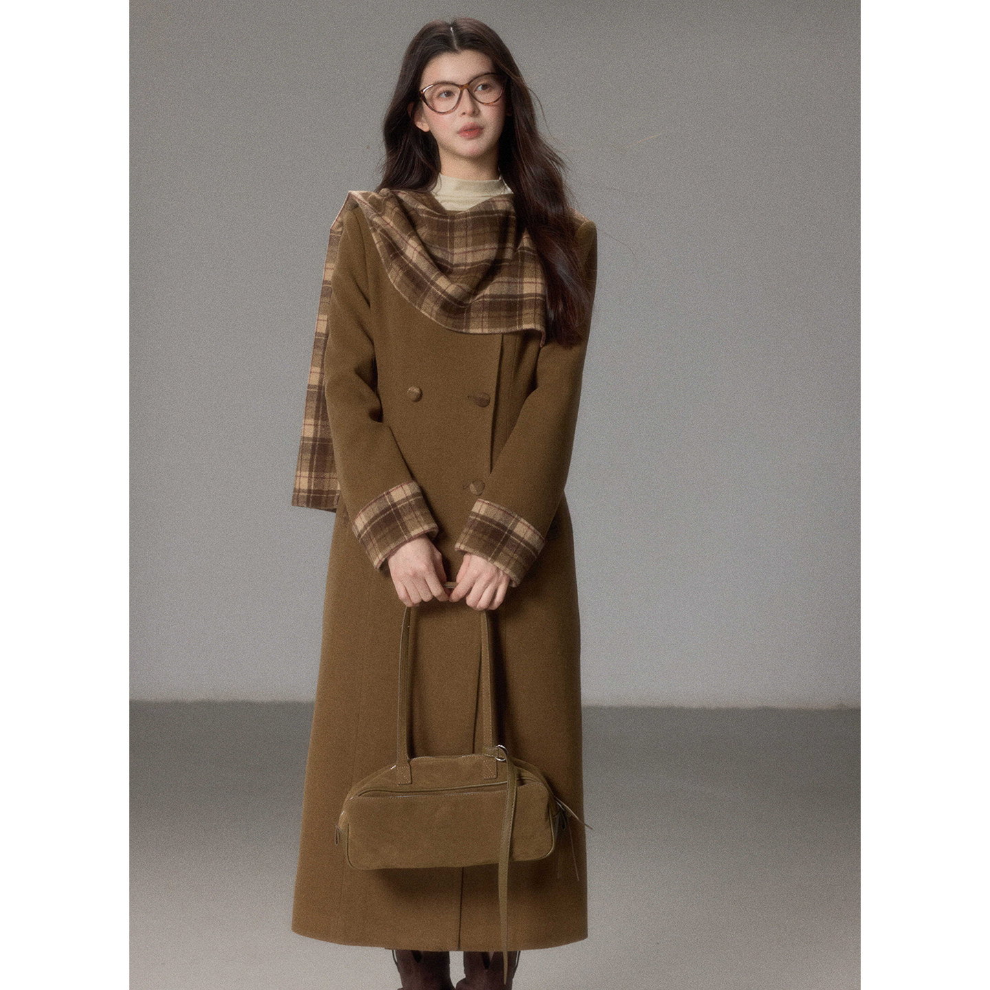 贰羊设计【雨诗禾】通勤格纹披肩一体夹棉毛呢外套女冬含羊毛大衣