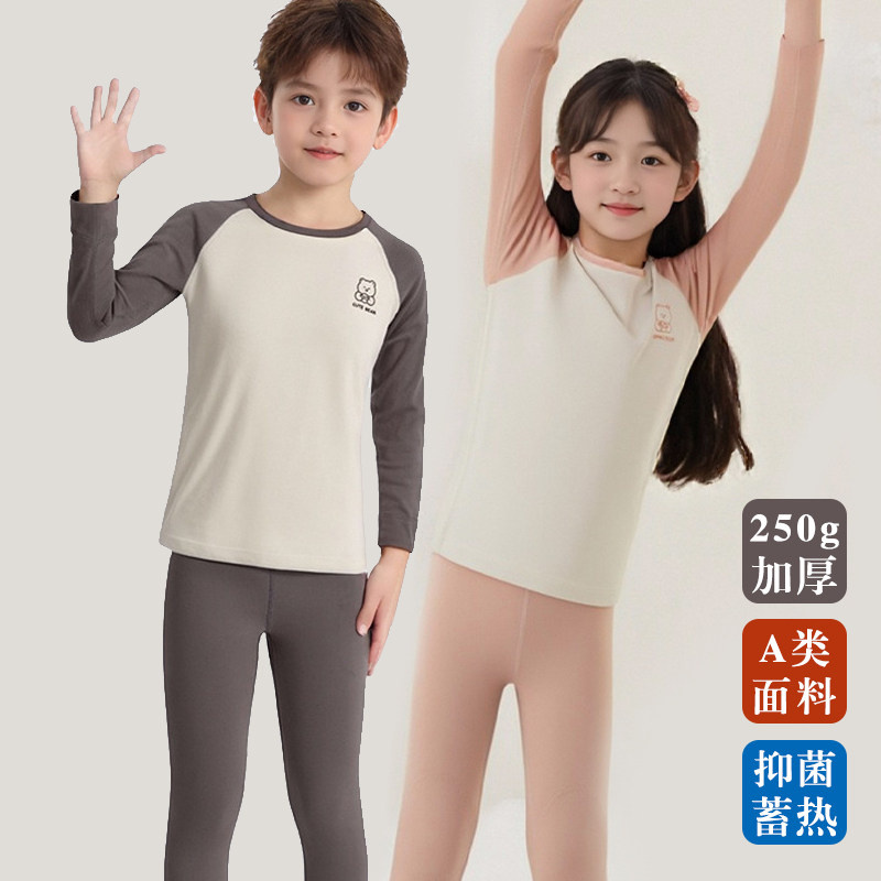 A类男女儿童德绒保暖内衣套装250克磨毛卡通小熊圆领加绒加厚发热
