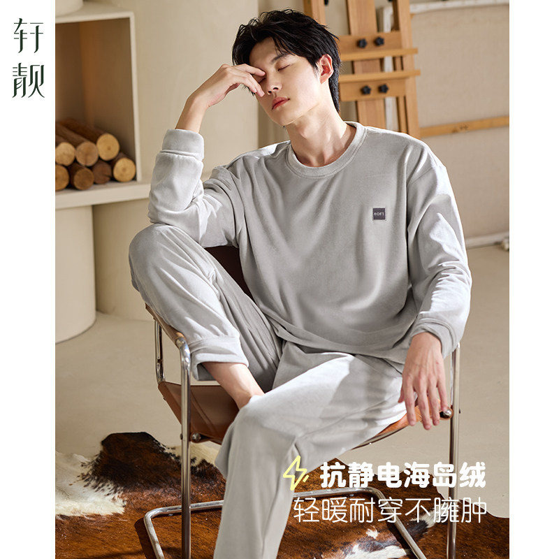 轩靓睡衣男士秋冬季加绒加厚保暖圆领套头海岛绒珊瑚绒家居服套装