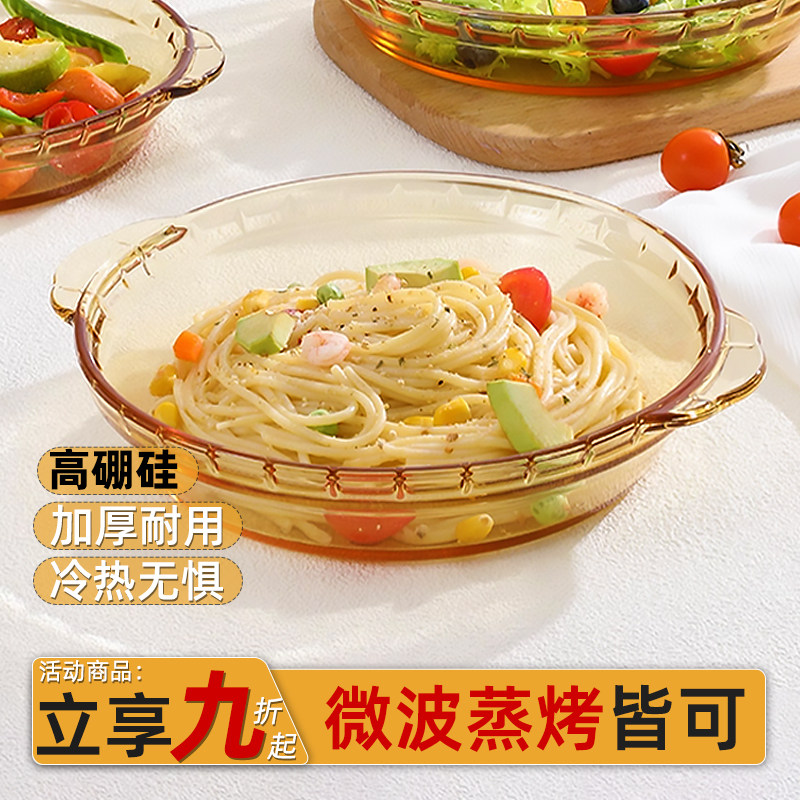 霜山玻璃烤盘家用圆形菜盘餐盘烤箱微波炉加热器皿焗饭盘双耳蒸盘