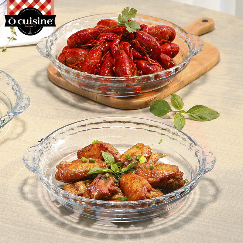 霜山玻璃烤盘家用圆形菜盘餐盘烤箱微波炉加热器皿焗饭盘双耳蒸盘