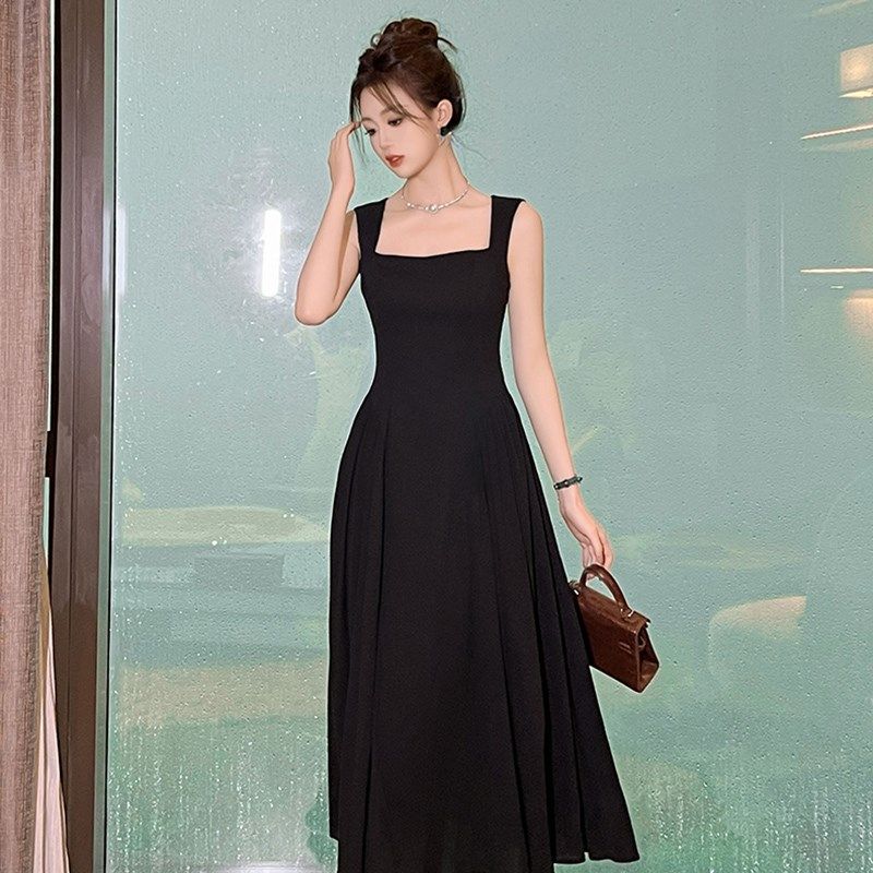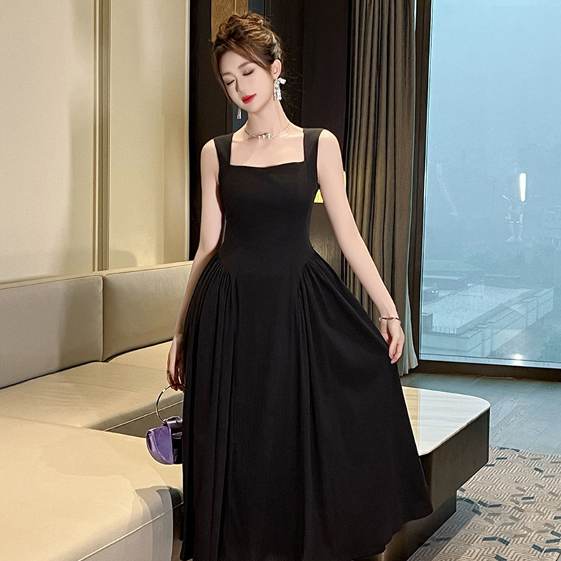 飘逸修身长款裙子显瘦茶歇桔梗小黑裙高级感无袖收腰蓬蓬连衣裙夏