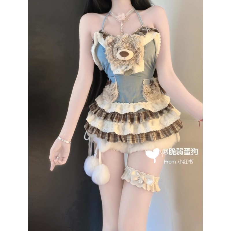 新款纯欲甜辣可爱少女感拼接蛋糕裙小熊挂脖修身无袖蓬蓬连衣裙子