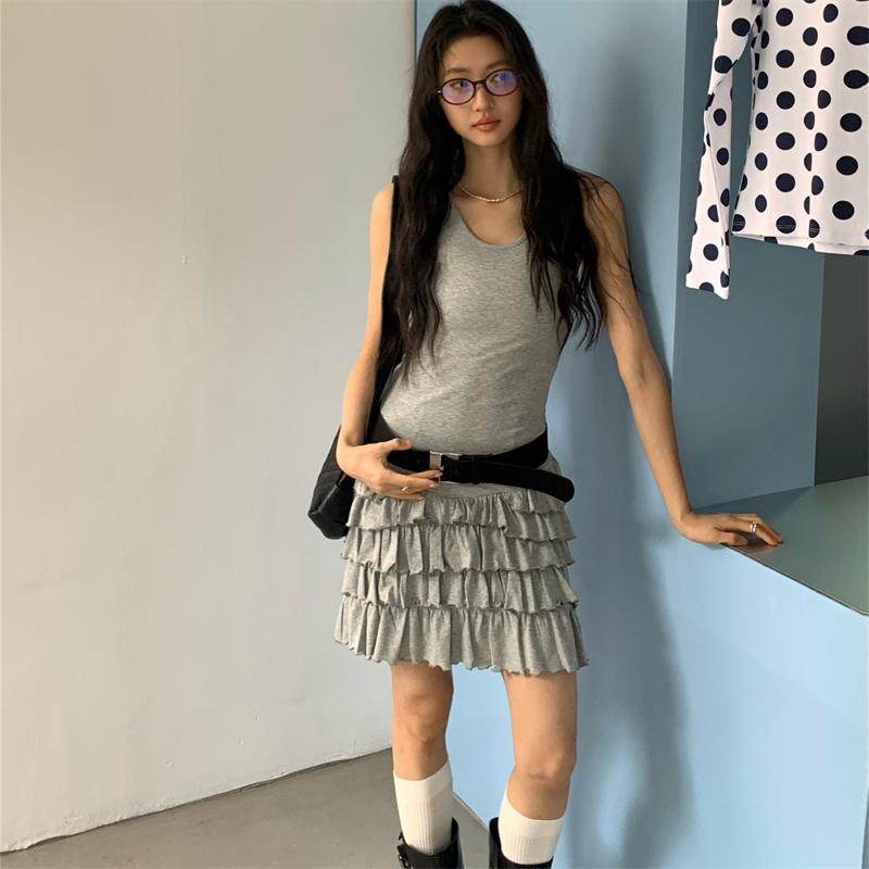MianCun美少女荷叶边蓬蓬摆无袖背心连衣裙女修身显瘦合体蛋糕裙