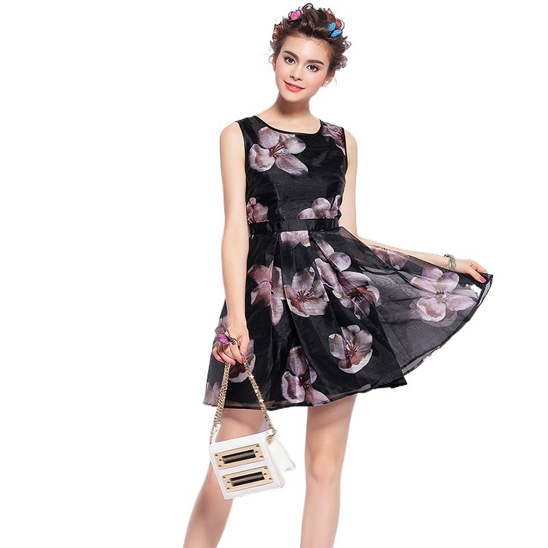 奈昕个性化私人定制 5043 赑修身无袖背心连衣裙高腰印花A字蓬蓬