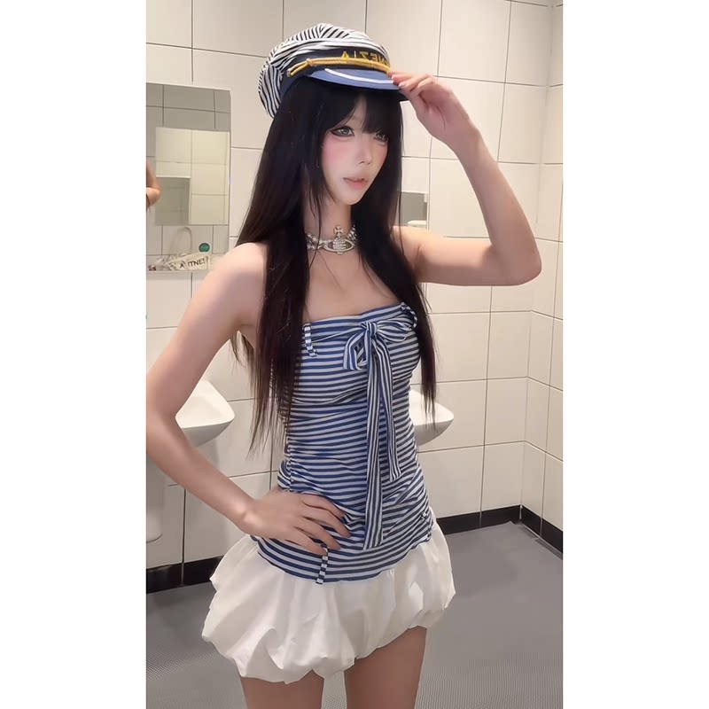 美式辣妹海军风条纹系带无袖抹胸连衣裙夏季收腰修身露肩蓬蓬短裙
