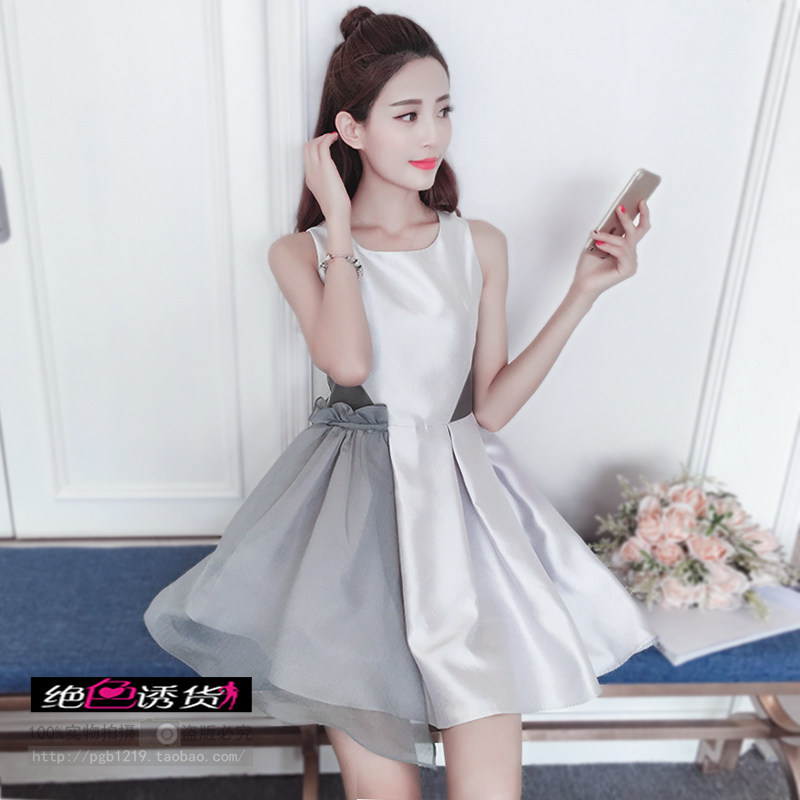 巩刘寨夏季欧根纱蓬蓬连衣裙女无袖名媛气质前短后长修身显瘦裙子