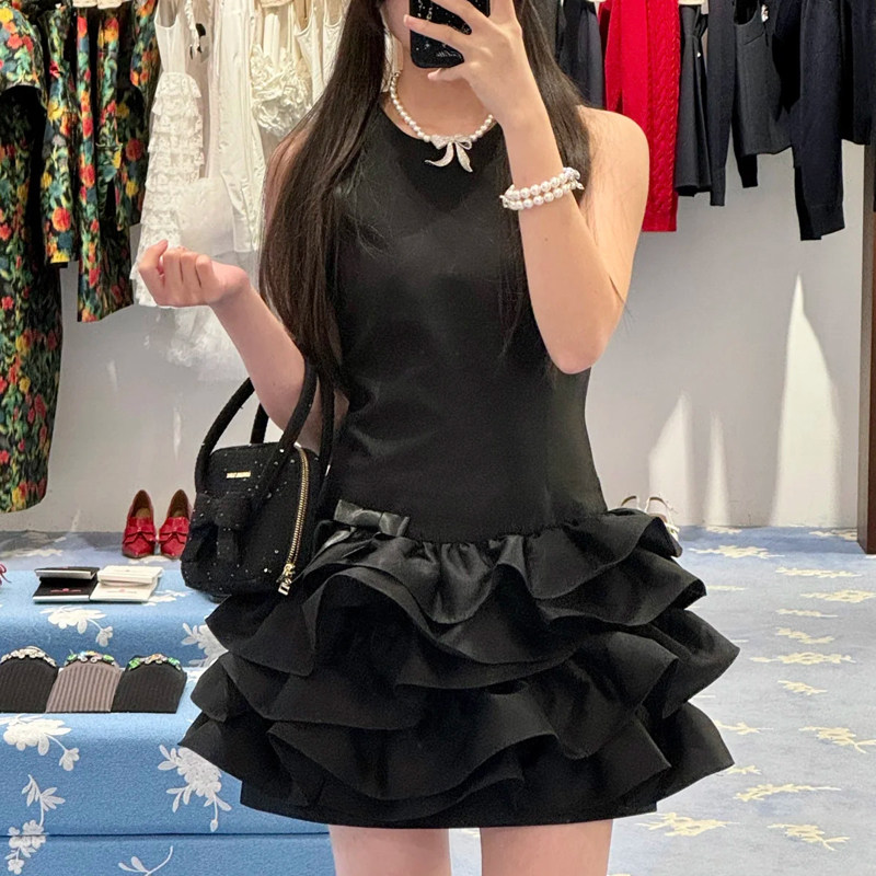 辰米范 黑色修身无袖背心连衣裙女夏季新款气质显瘦蓬蓬蛋糕短裙