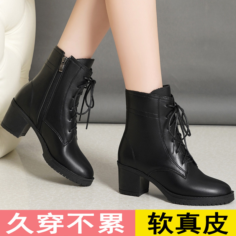 冬季加绒粗跟时装女靴真皮气质短靴百搭中跟靴子春秋单靴棉靴圆头