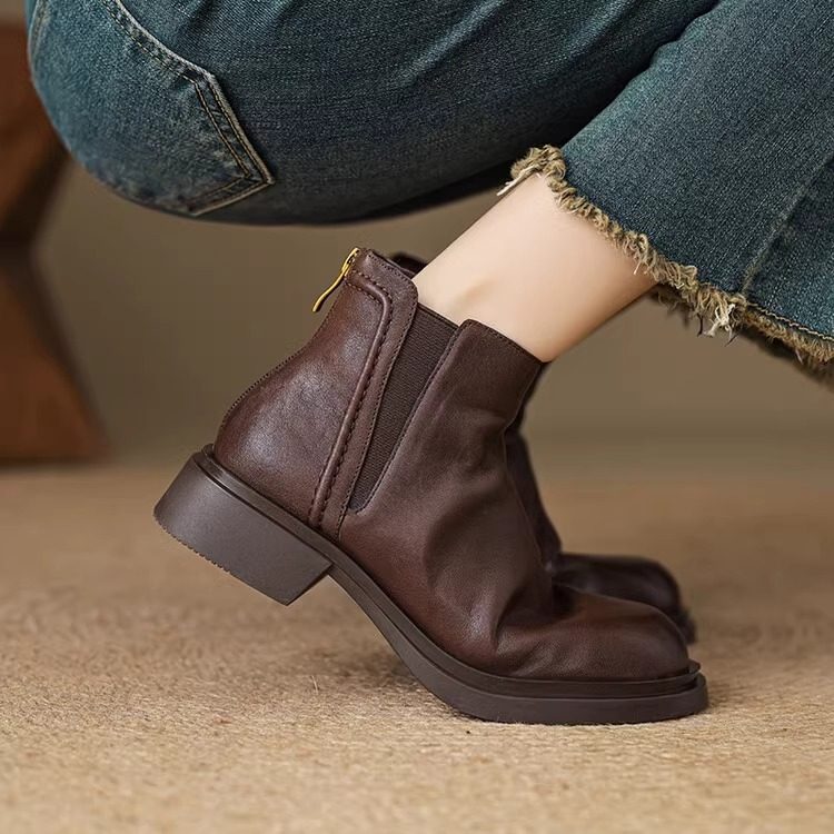 2025新款秋冬法式方头粗跟短靴女春秋软皮靴子中跟真皮鞋马丁女靴