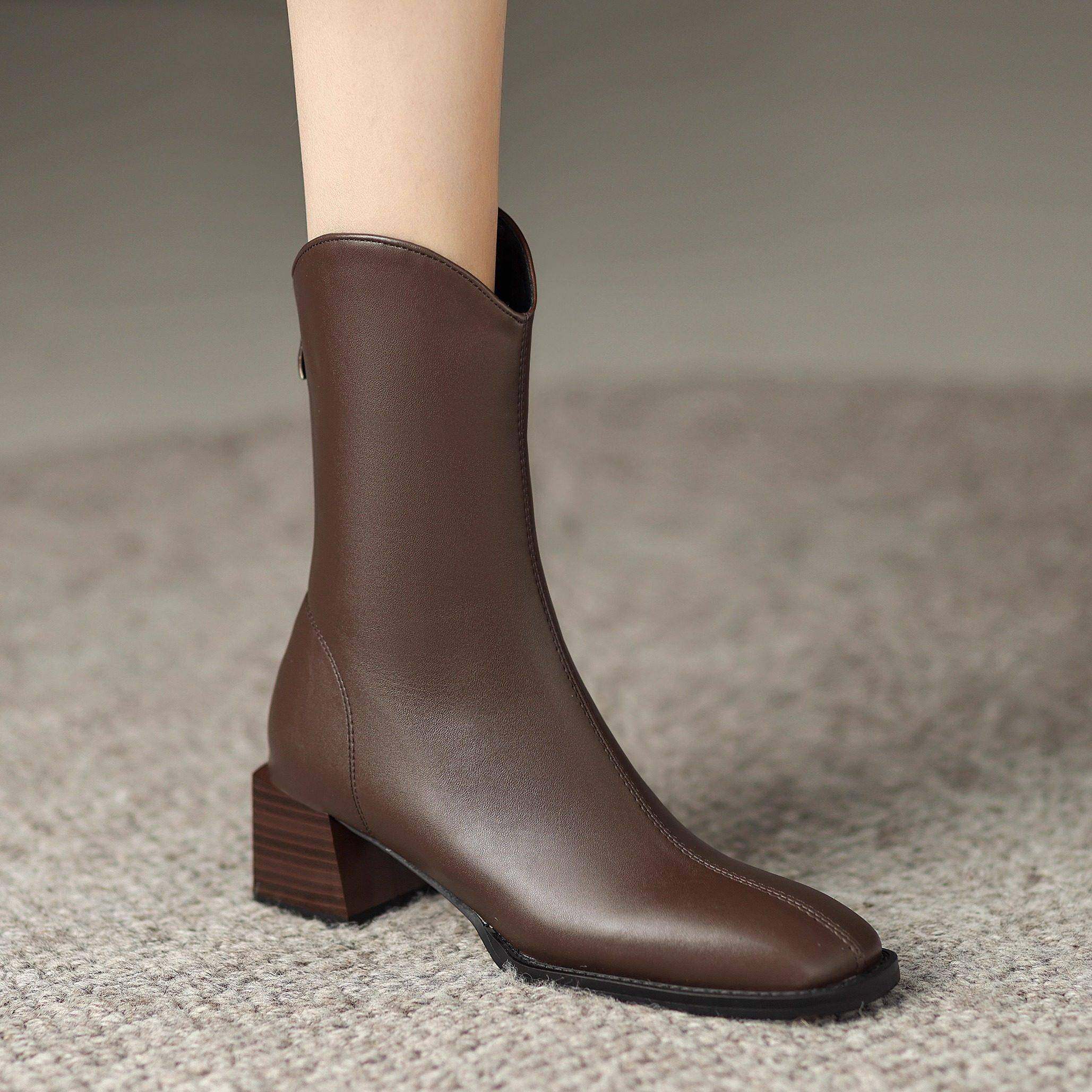 - 短靴女粗跟单靴真皮