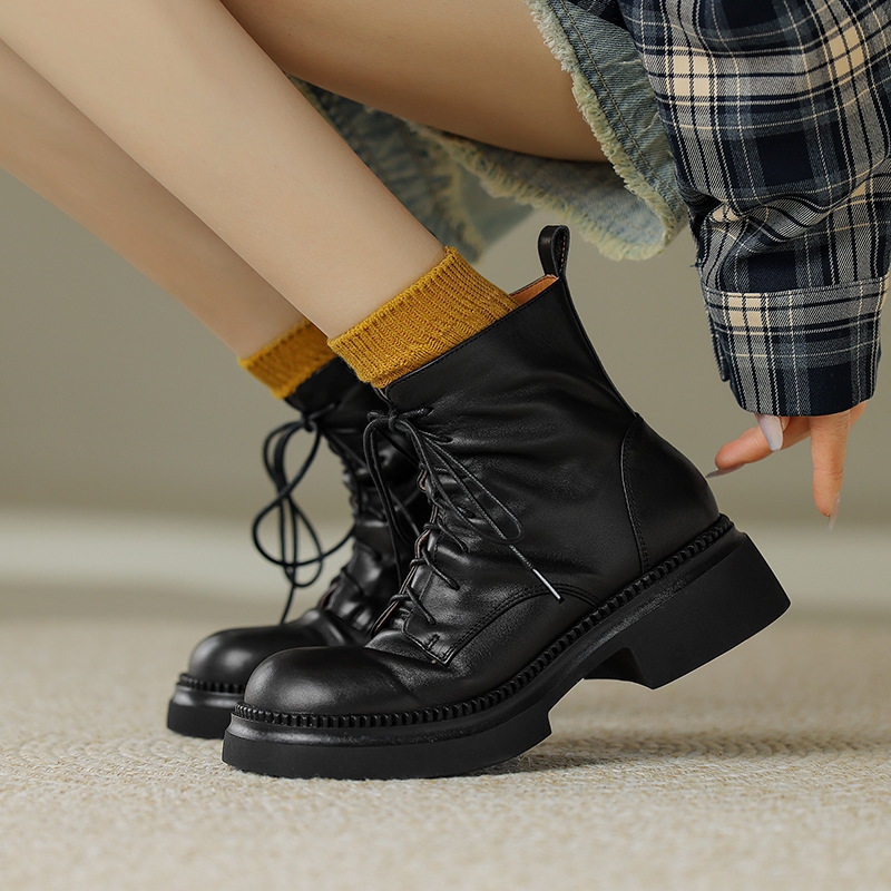 - 真皮粗跟短靴系带女马丁靴