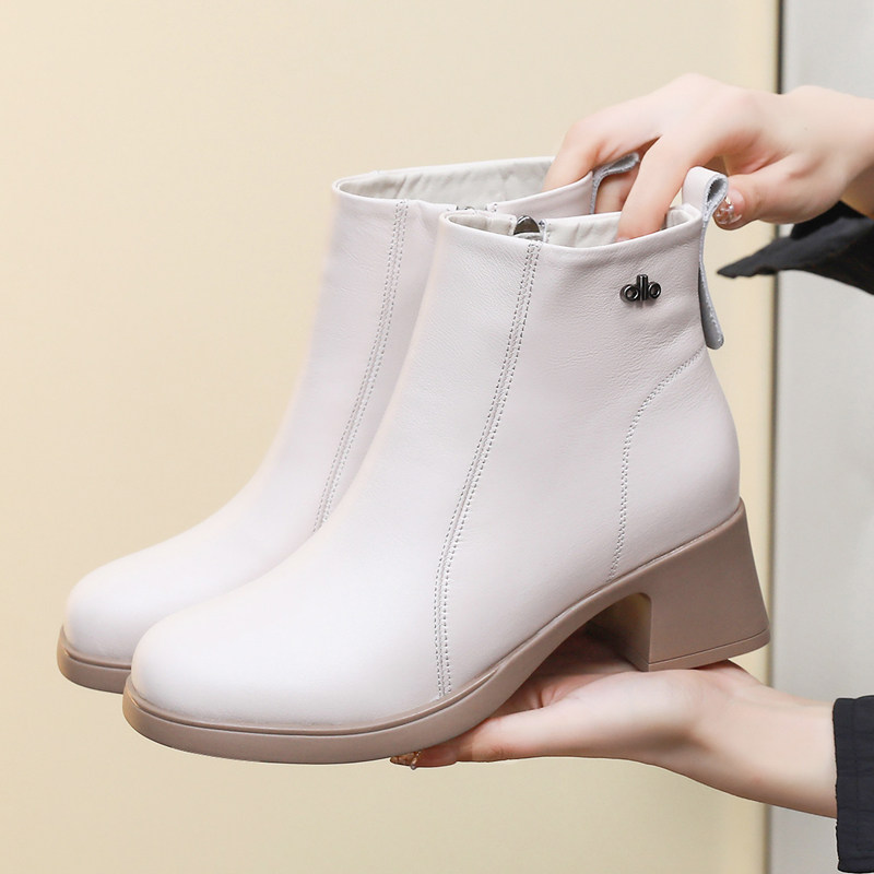 白色短靴女2025春秋季新款真皮尖头猫跟及踝靴单靴中跟加绒女靴子