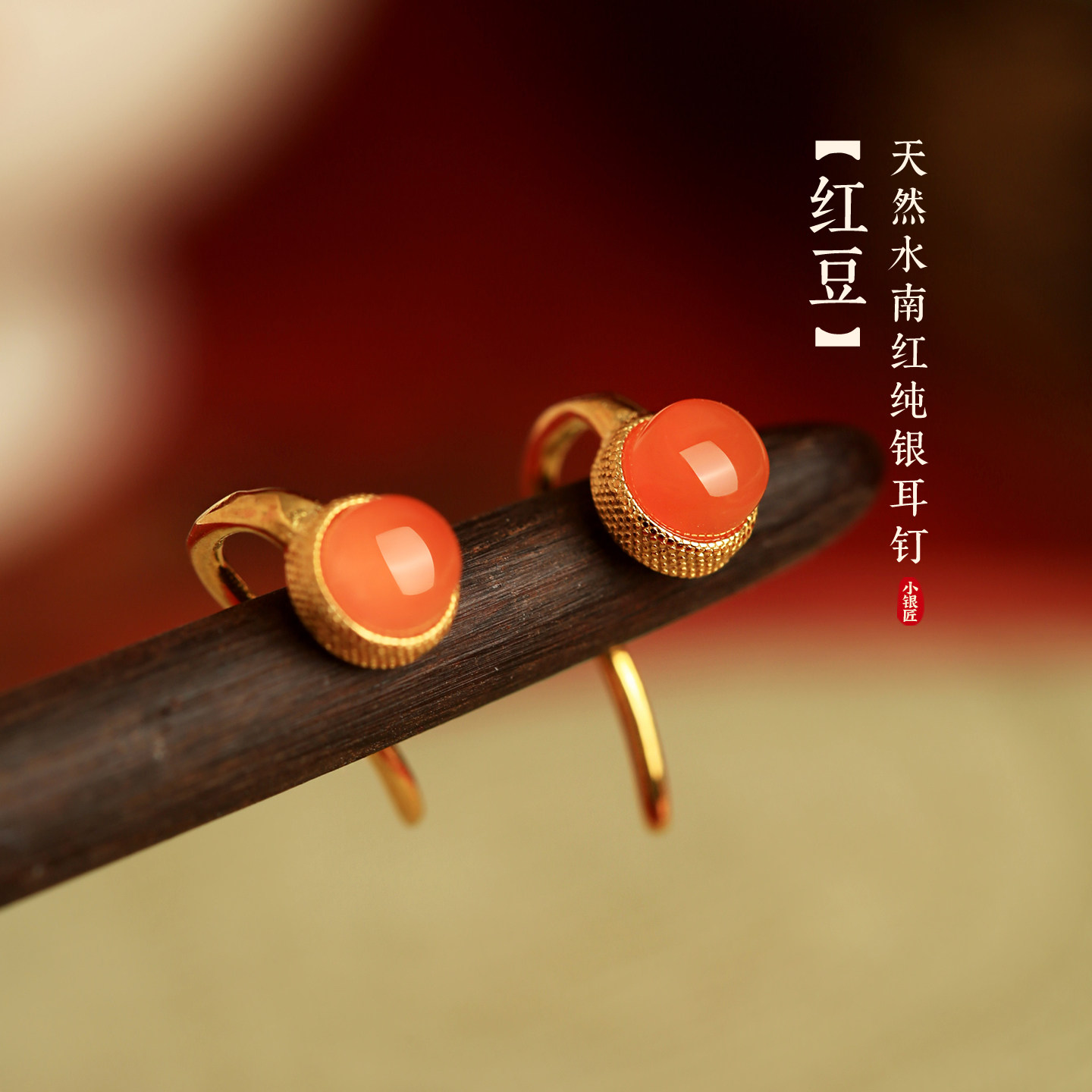 小银匠冰种天然南红耳饰纯银耳钉女新中式高级红色玉石红玛瑙耳环