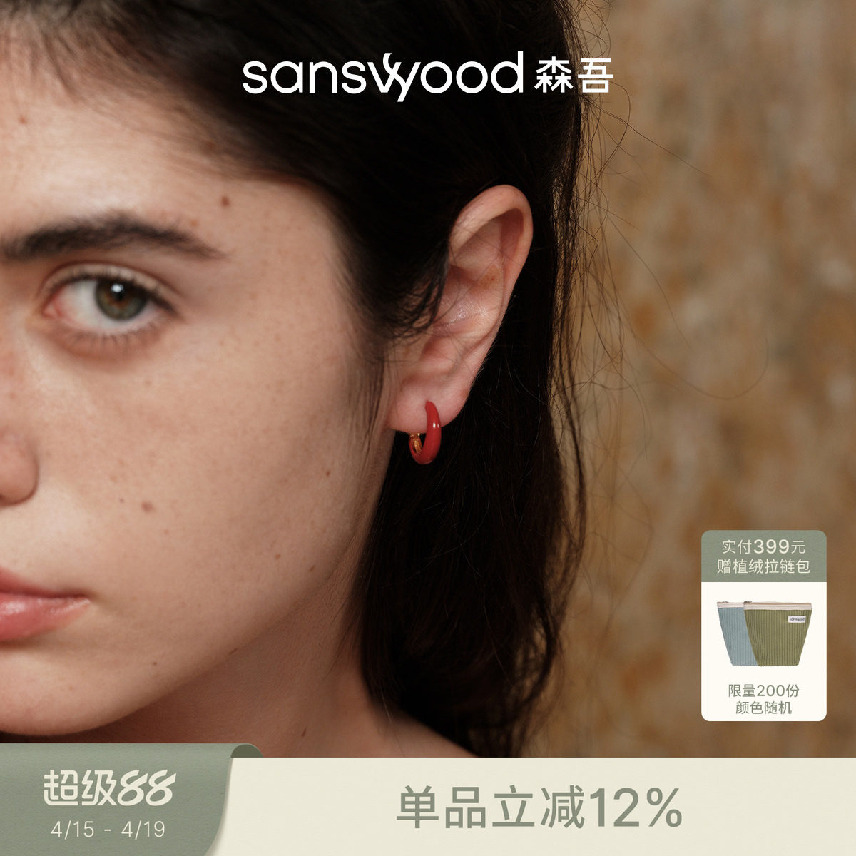 sanswood森吾 银镀金珐琅耳圈极简百搭通勤红色复古耳环耳饰女生