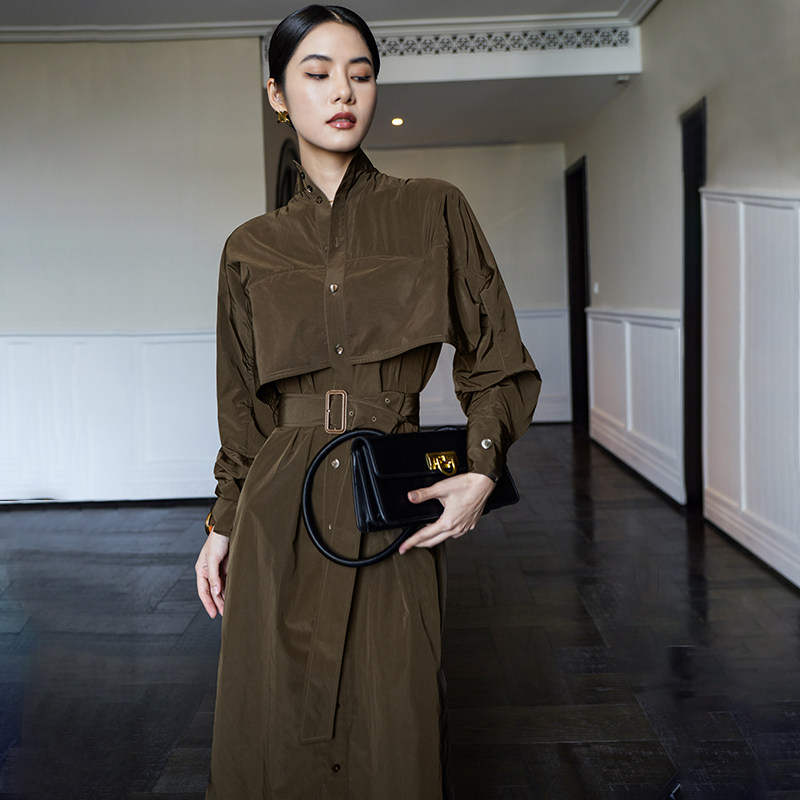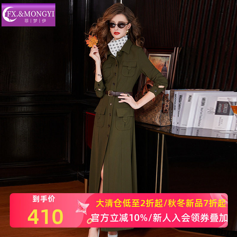 菲梦伊军绿色衬衫连衣裙女秋季高级气质单排扣收腰风衣外套送腰带