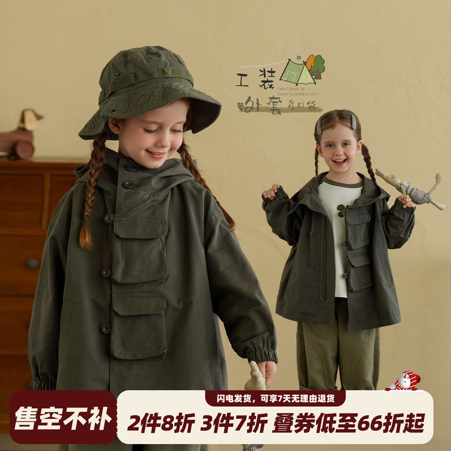 砚台家女童纯棉连帽外套2025秋新款军绿色中长款风衣儿童立体夹克
