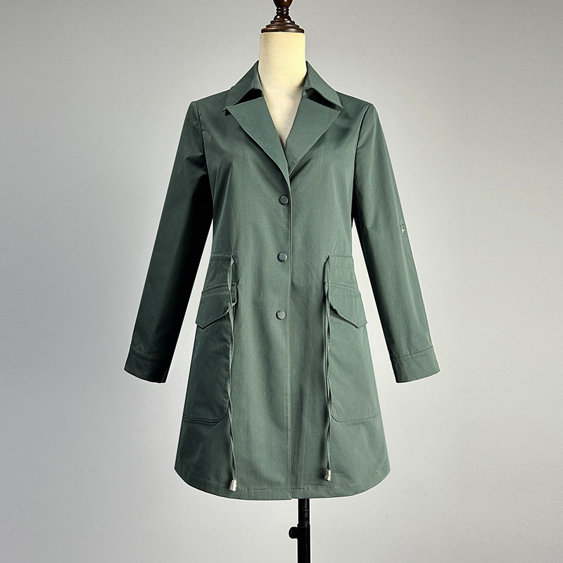 品牌军绿色长袖风衣女2025欧美风松紧腰防风防水西装领单排扣外套
