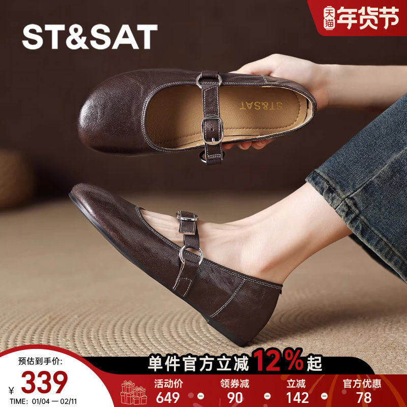 星期六棕色羊皮真皮平底小单鞋2025新款女士女款玛丽珍法式豆豆秋