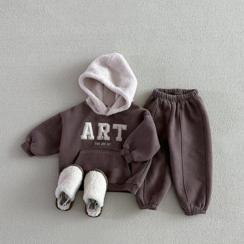 韩版ins英文字母纯色加绒连帽卫衣套装男女宝宝秋冬新款长袖加绒