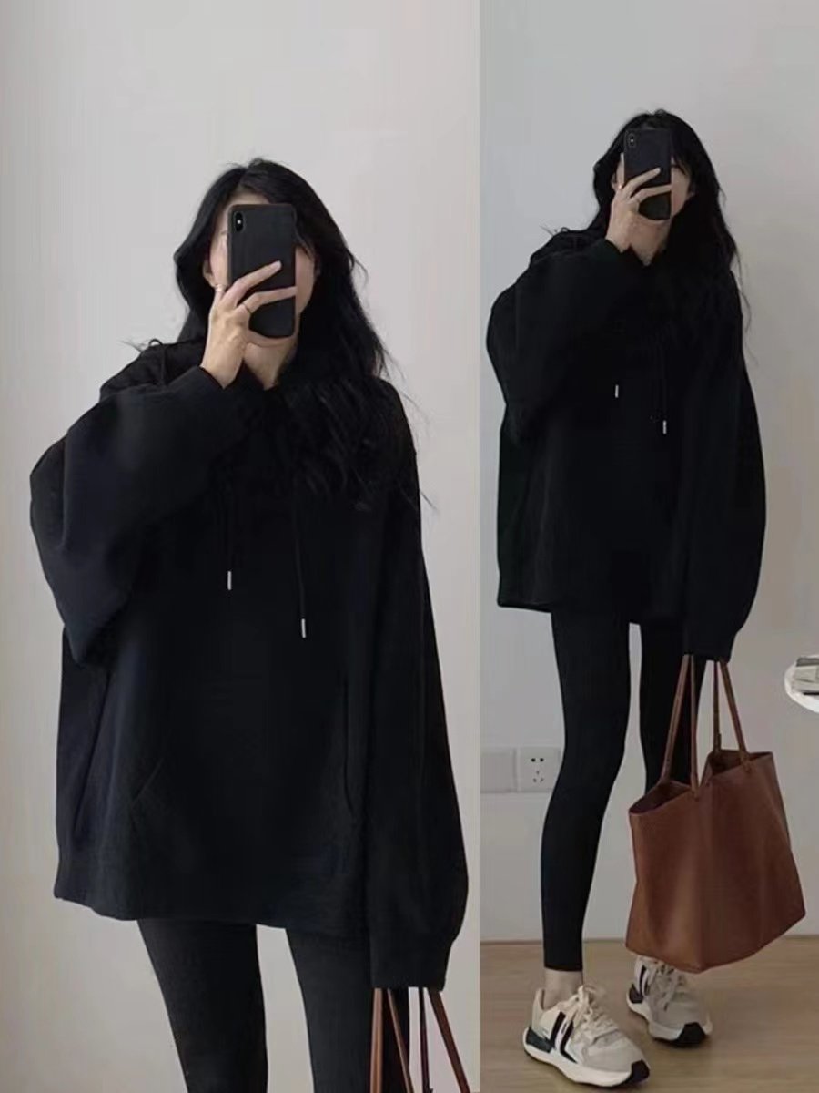 秋纯色中长款连帽卫衣女oversize外套韩版潮宽松慵懒开衫上衣ins