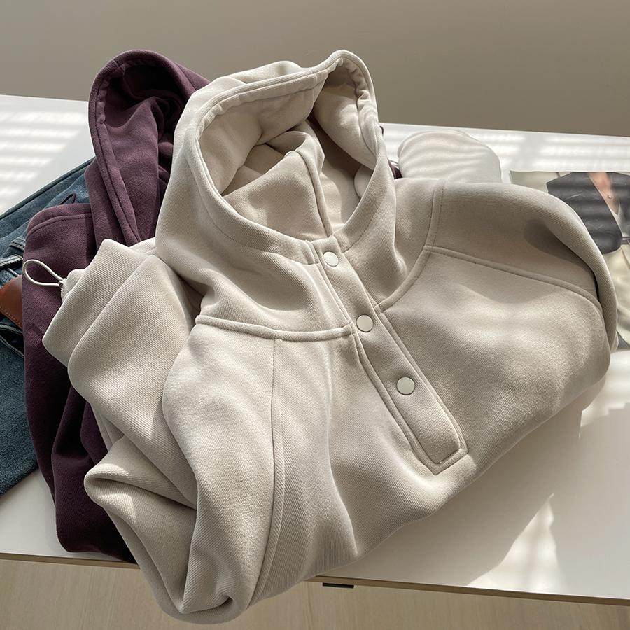 加绒加厚韩版纯色纽扣连帽套头插肩袖卫衣女宽松慵懒帽衫秋冬新款