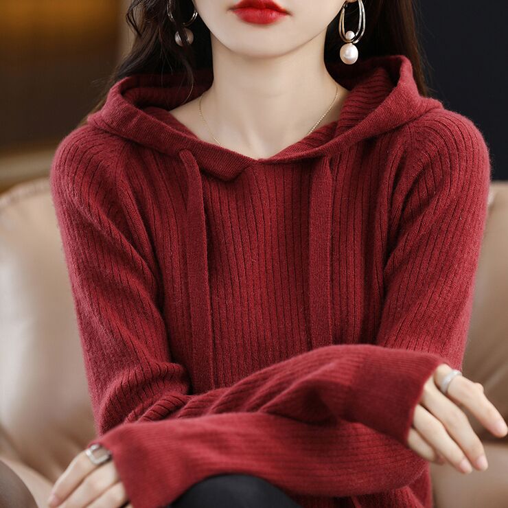 100%纯羊毛连帽针织衫女韩版纯色简约帽衫百搭设计感羊绒连帽卫衣