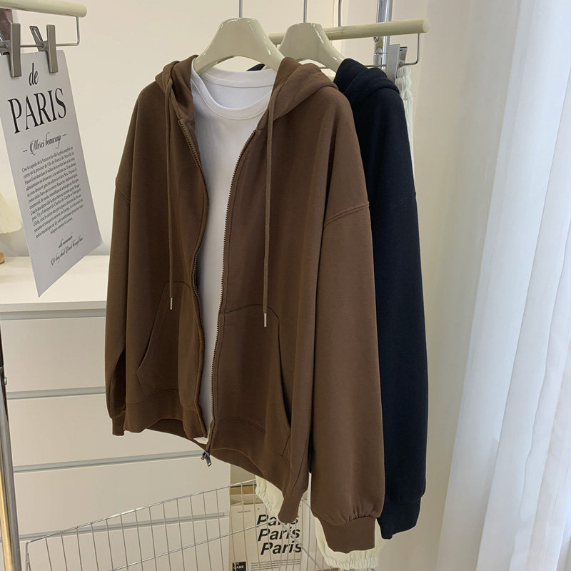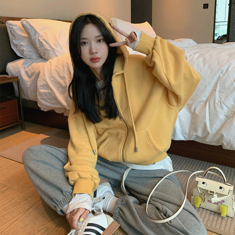 2025春秋装韩版新款纯色连帽开衫长袖加绒加厚宽松休闲卫衣外套女