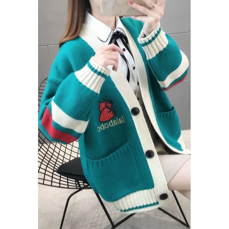 日系软妹甜美针织衫条纹毛衣外套女学生学院风中长款长袖宽松上衣