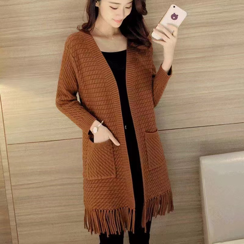 2025春装新款韩版女装中长款双口袋流苏开衫毛衣纯色百搭学生外套