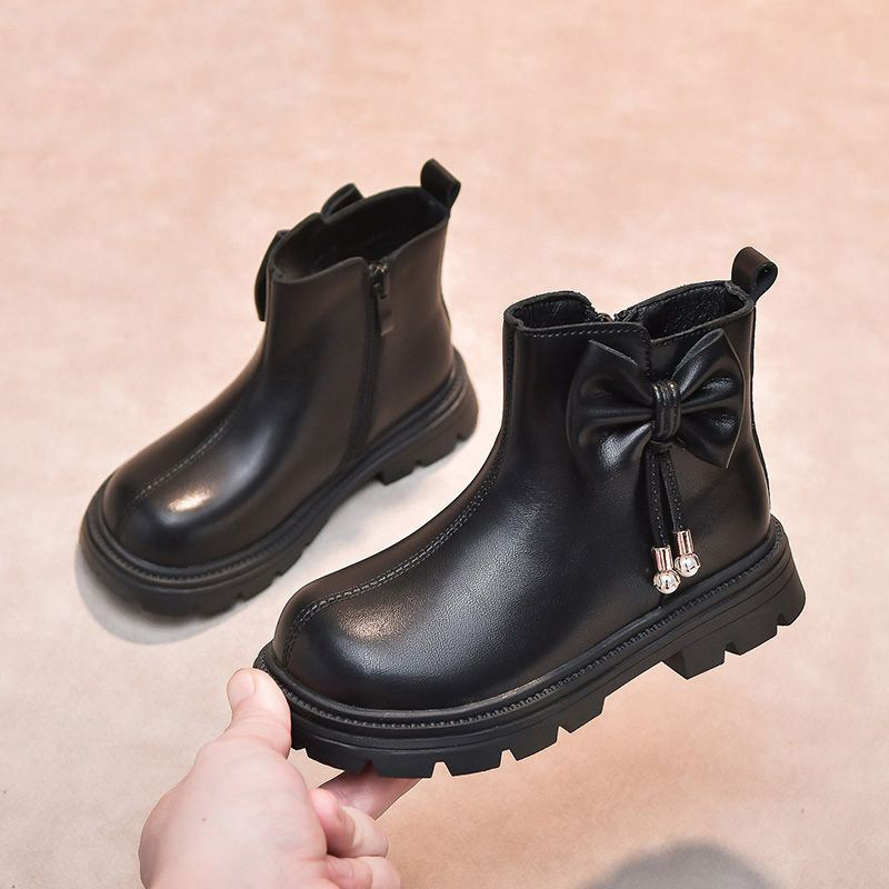 真皮女童靴子儿童马丁靴小公主短靴秋冬蝴蝶结软底宝宝加绒小皮靴