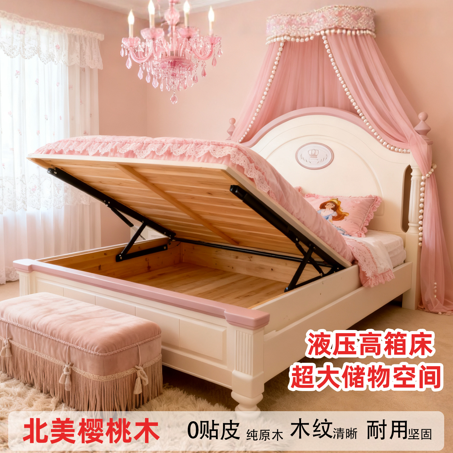 全实木儿童床女孩1米35原木1米5粉色套房家具液压高箱储物公主床