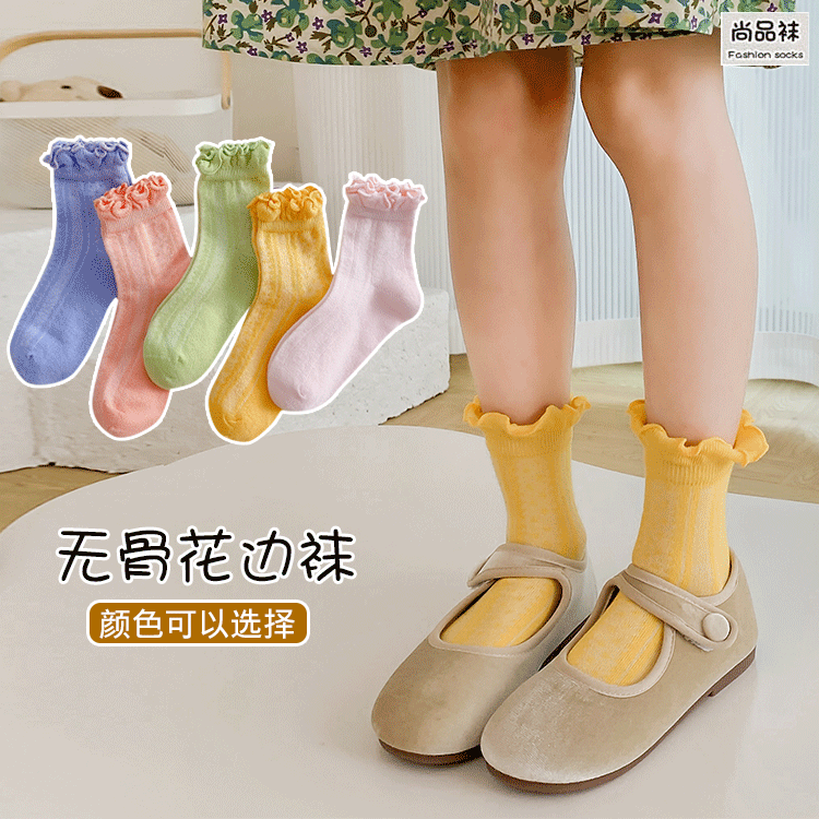女童袜纯棉无骨童袜春秋季花边女孩中筒袜公主百搭纯色中大童袜子