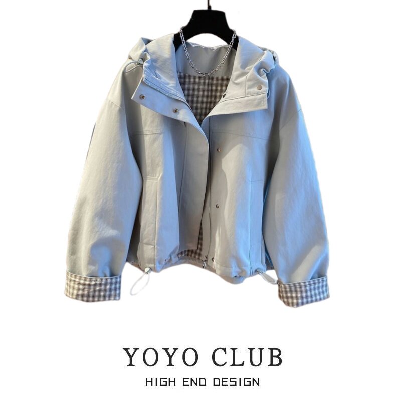 春秋短款外套女时尚洋气连帽宽松休闲冲锋衣大码两层防水防风夹克