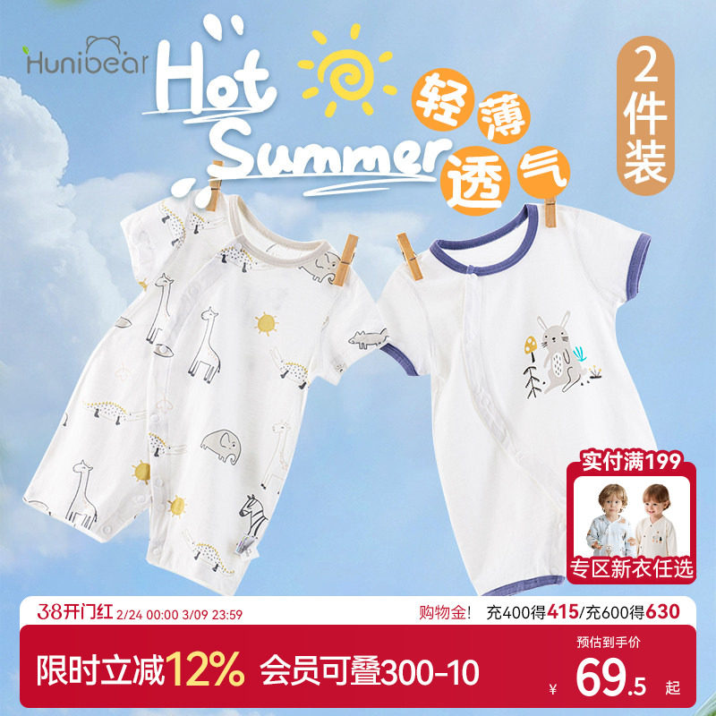 新生初生婴儿半袖连体衣2件装夏季薄款幼儿男宝宝短袖纯棉a类衣服