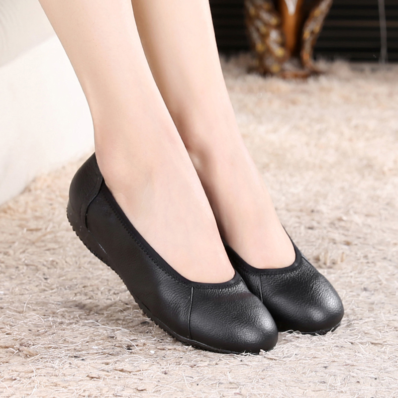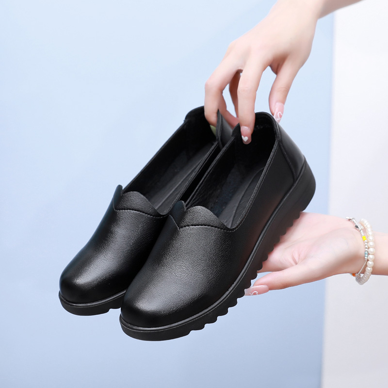 真皮工作鞋女黑色平底软底圆头皮鞋工鞋职业浅口单鞋大码妈妈女鞋